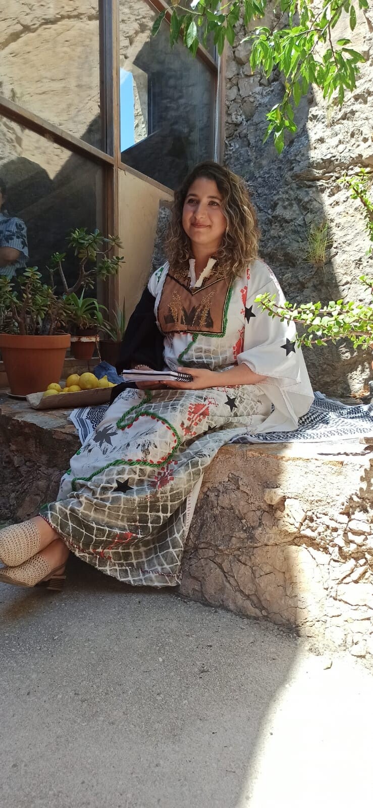 I created a traditional thobe embroidered with Palestinian motifs and local agricultural materials to map exile, abandonment, and continuity across both landscapes. Performed beneath a walnut tree during the village’s All Day Art Festival, the work curated a domestic, ceremonial setting using vessels filled with lemons while I read my grandmother’s poetry in Arabic and Spanish.